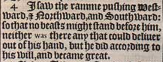 4 I saw the ramme pushing Westward, & Northward, and Southward: so that no beasts might stand before him, neither was there any that could deliuer out of his hand, but he did according to his will, and became great.