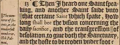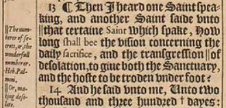 13 ¶ Dann hörte ich einen Heiligen sprechen und ein anderer Heiliger sagte zu ||dem gewissen heiligen, der sprach ‘Wie lang wird die Vision bezüglich des täglichen Opfers und des Verstoßes ||der Verwüstung, beides, das Heiligtum und das Heer unter Füßen zertreten, sein?’[||Die Anzahl der Geheimnisse, oder, die wundervolle Zahl Hebr.: Palmoni ||oder: verwüsten]