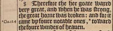 8 Therefore the hee goate waxed very great, and when he was strong, the great horne was broken: and for it came vp foure notable ones, *toward the foure windes of heauen. [ * Cha.11.4 ]