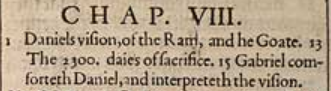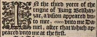 1 In the third yeere of the reigne of King Belshazzar, a vision appeared vnto mee, euen vnto me Daniel, after that which appeared vnto me at the first.