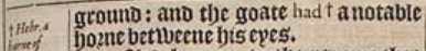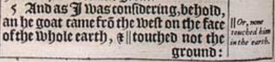 5 And as I was considering, behold, an he goat came frō the west on the face of the whole earth, & || touched not the ground: and the goate had +a notable horne betweene his eyes. [ || Or, none touched him in the earth. , Hebr. a horne of sight. ]