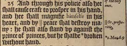 25 And through his policie also hee shall cause craft to prosper in his hand, and hee shall magnifie himselfe in his heart, and by || peace shal destroy many: he shall also stand vp against the prince of princes, but he shalbe *broken without hand. [ || Or, prosperitie. * , 2.Mac.6.9 ]