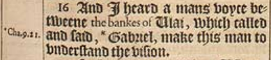 16 And I heard a mans voyce betweene the bankes of Ulai, which called and said, *Gabriel, make this man to vnderstand the vision. [ * Cha.9.21.]