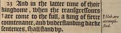 23 And in the latter time of their kingdome, when the transgressours +are come to the full, a king of fierce countenance, and vnderstanding darke sentences, shall stand vp. [ +Heb. are accomplished. ]