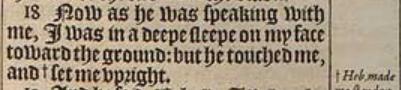 18 Now as he was speaking with me, I was in a deepe sleepe on my face toward the ground: but he touched me, and + set me vpright. [ + Heb. made me stand vpon my standing. ]