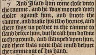 7 And I saw him come close vnto the ramme, and he was mooued with choler against him, and smote the ramme, and brake his two hornes, and there was no power in the ramme to stand before him, but he cast him downe to the ground, and stamped vpon him, and there was none that could deliuer the ramme out of his hand.