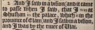2 And I saw in a vision (and it came to passe when I saw, that I was at Shushan in the palace, which is in the prouince of Elam) and I saw in a vision, and I was by the riuer of Ulai.