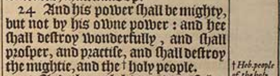 24 And his power shall be mighty, but not by his owne power: and hee shall destroy wonderfully, and shall prosper, and practise, and shall destroy the mightie, and the +holy people. [ +Heb. people of the holy ones. ]