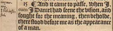 15 ¶ And it came to passe, when I, euen I Daniel had seene the vision, and sought for the meaning, then beholde, there stood before me as the appearance of a man.
