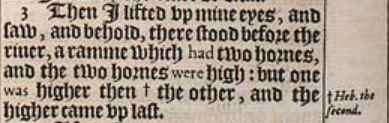 3 Then I lifted vp mine eyes, and saw, and behold, there stood before the riuer, a ramme which had two hornes, and the two hornes were high: but one was higher then+ the other, and the higher came vp last. [ + Heb. the second. ]