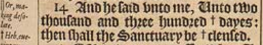 14 And he said vnto me, Unto two thousand and three hundred + dayes: then shall the Sanctuary be +clensed. [ + Heb. euening morning. + Heb. iustified. ]