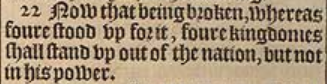 22 Now that being broken, whereas foure stood vp for it, foure kingdomes shall stand vp out of the nation, but not in his power.