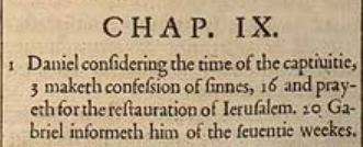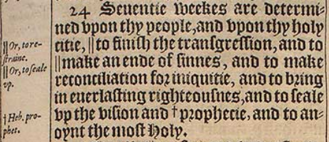 24 Seuentie weekes are determined vpon thy people, and vpon thy holy citie, || to finish the transgression, and to || make an ende of sinnes, and to make reconciliation for iniquitie, and to bring in euerlasting righteousnes, and to seale vp the vision and +prophecie, and to anoynt the most Holy.