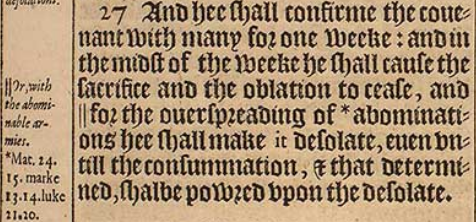 27 And hee shall confirme the couenant with many for one weeke: and in the midst of the weeke he shall cause the sacrifice and the oblation to cease, and || for the ouerspreading of *abominations hee shall make it desolate, euen vntill the consummation, & that determined, shalbe powred vpon the desolate. [ || Or, with the abominable armies. , * Mat. 24. 15. marke 13.14. luke 21.20. ]