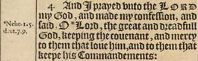 4 And I prayed vnto the Lord my God, and made my confession, and said; O *Lord, the great and dreadfull God, keeping the couenant, and mercy to them that loue him, and to them that keepe his Commandements: [ *Nehe.1.5. deut.7.9. ]