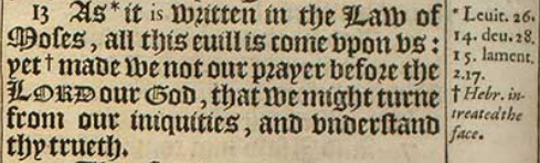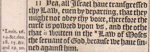 11 Yea, all Israel haue transgressed thy Law, euen by departing, that they might not obey thy voice, therefore the curse is powred vpon vs, and the othe that is written in the *Law of Moses the seruant of God, because we haue sinned against him. [ *Leuit. 26. 14. &c. deu. 28. 15. &c. and 29. 29. &c. and 30. 17, 18. and 31. 17. &c. and 32. 19. &c. ]