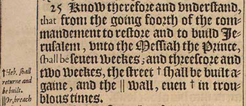 25 Know therefore and vnderstand, that from the going foorth of the commandement to restore and to build Ierusalem, vnto the Messiah the Prince, shall be seuen weekes; and threescore and two weekes, the street + shall be built againe, and the || wall, euen +in troublous times. [ +Heb. shall returne and be built. , || Or, breach or ditch. , +Hebr. in strait of times. ]