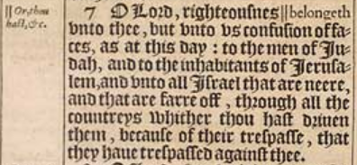 7 O Lord, righteousnes || belongeth vnto thee, but vnto vs confusion of faces, as at this day: to the men of Iudah, and to the inhabitants of Ierusalem, and vnto all Israel that are neere, and that are farre off, through all the countreys whither thou hast driuen them, because of their trespasse, that they haue trespassed against thee.