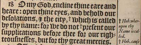 18 O my God, encline thine eare and heare: open thine eyes, and behold our desolations, & the city, +which is called by thy name: for we do not +present our supplications before thee for our righteousnesses, but for thy great mercies. [ +Heb. wherupon thy Name is called. , +Heb. cause to fall. ]