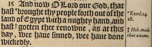 15 And now O Lord our God, that hast *brought thy people forth out of the land of Egypt with a mighty hand, and hast +gotten thee renowne, as at this day, wee haue sinned, wee haue done wickedly. [ * Exod.14 28. , +Heb. made thee a name. ]