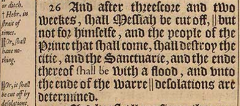 26 And after threescore and two weekes, shall Messiah be cut off, || but not for himselfe, and the people of the Prince that shall come, shall destroy the citie, and the Sanctuarie, and the ende thereof shall be with a flood, and vnto the ende of the warre ||desolations are determined. [ || Or, shall haue nothing. , || Or, it shall be cut off by desolations. ]