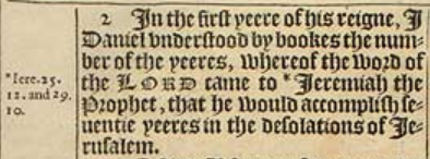 2 In the first yeere of his reigne, I Daniel vnderstood by bookes the number of the yeeres, whereof the word of the LORD came to *Ieremiah the Prophet, that he would accomplish seuentie yeeres in the desolations of Ierusalem. [ * Iere.25. 12. and 29. 10.]