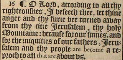16 ¶ O Lord, according to all thy righteousnes, I beseech thee, let thine anger and thy furie bee turned away from thy citie Ierusalem, thy holy Mountaine: because for our sinnes, and for the iniquities of our fathers, Ierusalem and thy people are become a reproch to all that are about vs.