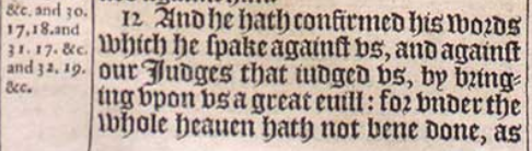 12 And he hath confirmed his words which he spake against vs, and against our Iudges that iudged vs, by bringing vpon vs a great euill: for vnder the whole heauen hath not bene done, as hath bene done vpon Ierusalem.