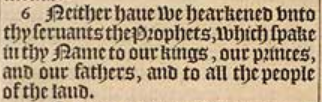 6 Neither haue we hearkened vnto thy seruants the Prophets, which spake in thy Name to our kings, our princes, and our fathers, and to all the people of the land.