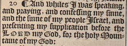 20 ¶ And whiles I was speaking, and praying, and confessing my sinne, and the sinne of my people Israel, and presenting my supplication before the LORD my God, for the holy Mountaine of my God: