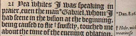 21 Yea whiles I was speaking in praier, euen the man *Gabriel, whom I had seene in the vision at the beginning, being caused to flie +swiftly, touched me about the time of the euening oblation. [ *Dan.8.16. , +Hebr. with wearinesse or flight. ]