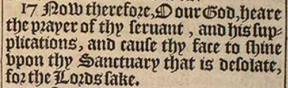 17 Now therefore, O our God, heare the prayer of thy seruant, and his supplications, and cause thy face to shine vpon thy Sanctuary that is desolate, for the Lords sake.