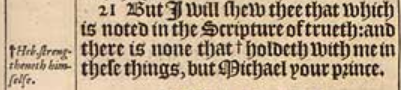 21 But I will shew thee that which is noted in the Scripture of trueth: and there is none that +holdeth with me in these things, but Michael your prince. [ +Heb. strengtheneth himselfe. ]