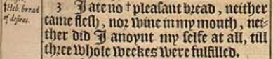 3 I ate no +pleasant bread, neither came flesh, nor wine in my mouth, neither did I anoynt my selfe at all, till three whole weekes were fulfilled. [ +Heb. bread of desires. ]