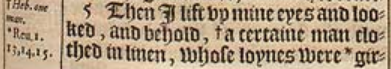 5 Then I lift vp mine eyes and looked, and behold, +a certaine man clothed in linen, whose loynes were *girded with fine gold of Uphaz. [ +Heb. one man. , *Reu.1. 13,14,15.]