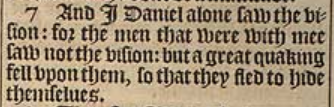 7 And I Daniel alone saw the vision: for the men that were with mee saw not the vision: but a great quaking fell vpon them, so that they fled to hide themselues.