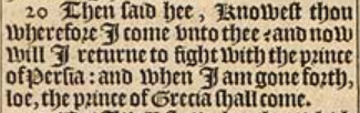 20 Then said hee, Knowest thou wherefore I come vnto thee? and now will I returne to fight with the prince of Persia: and when I am gone forth, loe, the prince of Grecia shall come.