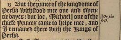 13 But the prince of the kingdome of Persia withstood mee one and twentie dayes: but loe, Michael || one of the chiefe Princes came to helpe mee, and I remained there with the Kings of Persia. [ || Or, the first. ]
