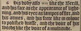 6 His body also was like the Berill, and his face as the appearance of lightning, and his eyes as lampes of fire, and his armes, and his feete like in colour to polished brasse, and the voice of his words like the voice of a multitude.