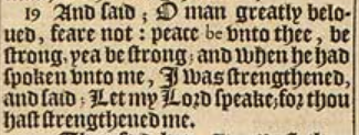 19 And said; O man greatly beloued, feare not: peace be vnto thee, be strong, yea be strong; and when he had spoken vnto me, I was strengthened, and said; Let my Lord speake; for thou hast strengthened me.