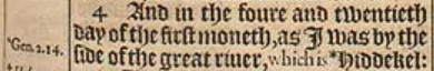 4 And in the foure and twentieth day of the first moneth, as I was by the side of the great riuer, which is *Hiddekel: [ *Gen.2.14. ]