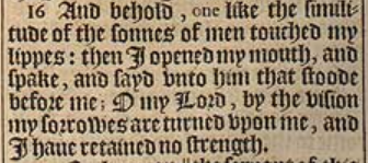 16 And behold, one like the similitude of the sonnes of men touched my lippes: then I opened my mouth, and spake, and sayd vnto him that stoode before me; O my Lord, by the vision my sorrowes are turned vpon me, and I haue retained no strength.