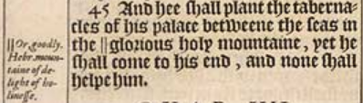 45 Und er wird das Tabernakel seines Palasts zwischen den Meeren im herrlichen heiligen Berg, doch wird er an sein Ende kommen und niemand wird ihm helfen.[||oder: göttlich Hebr.: Berg der Freude der Heiligkeit]