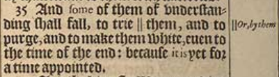 35 And some of them of vnderstanding shall fall, to trie || them, and to purge, and to make them white, euen to the time of the end: because it is yet for a time appointed. [ || Or, by them ]