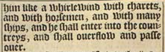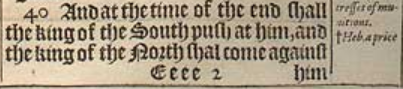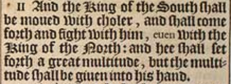 40 And at the time of the end shall the king of the South push at him, and the king of the North shal come against him like a whirlewind with charets, and with horsemen, and with many ships, and he shall enter into the countreys, and shall ouerflow and passe ouer.