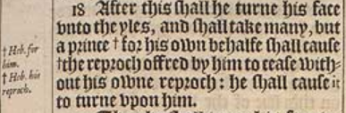 18 After this shall he turne his face vnto the yles, and shall take many, but a prince +for his own behalfe shall cause +the reproch offred by him to cease without his owne reproch: he shall cause it to turne vpon him. [ +Heb. for him. , +Heb his reproch. ]
