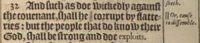 32 And such as doe wickedly against the couenant, shall he || corrupt by flatteries: but the people that do know their God, shall be strong and doe exploits. [ || Or, cause to dissemble. ]