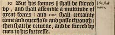 10 But his sonnes || shall be stirred vp, and shall assemble a multitude of great forces: and one shall certainly come and ouerflow and passe through: then shall he returne, and be stirred vp euen to his fortresse.