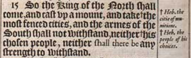 15 So the King of the North shall come, and cast vp a mount, and take +the most fenced cities, and the armes of the South shall not withstand, neither +his chosen people, neither shall there be any strength to withstand. [ +Heb. the citie of munitions. , +Heb. the people of his choices. ]