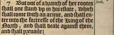 7 But out of a branch of her rootes shall one stand vp in his estate, which shall come with an armie, and shall enter into the fortresse of the King of the North, and shall deale against them, and shall preuaile:
